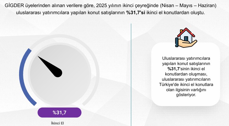GİGDEKS 17’de GİGDER üyelerine, “2025 ikinci çeyrekte (nisan – mayıs – haziran) uluslararası yatırımcıya gerçekleştirdiğiniz konut satışlarının yüzde kaçı ikinci eldi?” sorusu yöneltildi. GİGDER üyelerinden alınan verilere göre, 2025 yılının ikinci çeyreğinde uluslararası yatırımcılara yapılan konut satışlarının %31,7'si ikinci el konutlardan oluştu. Bu durum uluslararası yatırımcıların Türkiye'de ikinci el konutlara olan ilgisinin varlığını gösterdi.