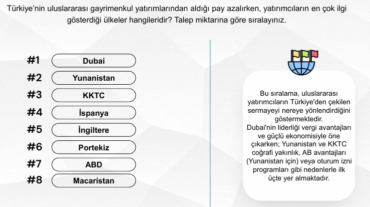 Yukarıdaki sıralamaya göre Dubai'nin liderliği vergi avantajları ve güçlü ekonomisiyle açıklanabilecekken; Yunanistan ve KKTC’nin coğrafi yakınlık, AB avantajları (Yunanistan için) veya oturum izni programları gibi nedenlerle ilk üçte yer aldığı düşünülmektedir.