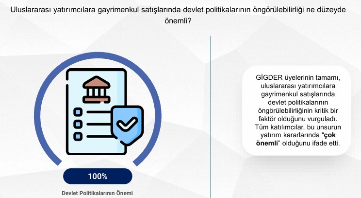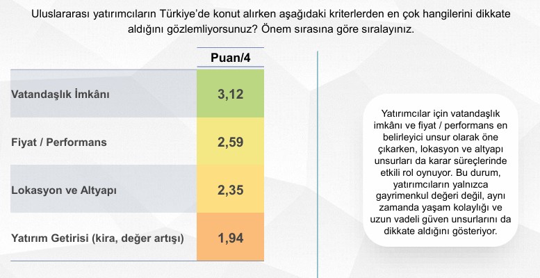 GİGDEKS 18’de GİGDER üyelerine uluslararası yatırımcıların Türkiye’de konut alırken en çok hangi kriterleri dikkate aldığı da soruldu. Sonuçlara göre uluslararası yatırımcıların Türkiye’de konut tercihinde öne çıkan kriterler arasında vatandaşlık imkânı, fiyat/performans dengesi, lokasyon ve altyapı olanakları yer aldı. Bu bulgular, yatırımcıların yalnızca mülk değerine değil yaşam kalitesi, erişim kolaylığı ve uzun vadeli güven unsurlarına da önem verdiğini gösteriyor.