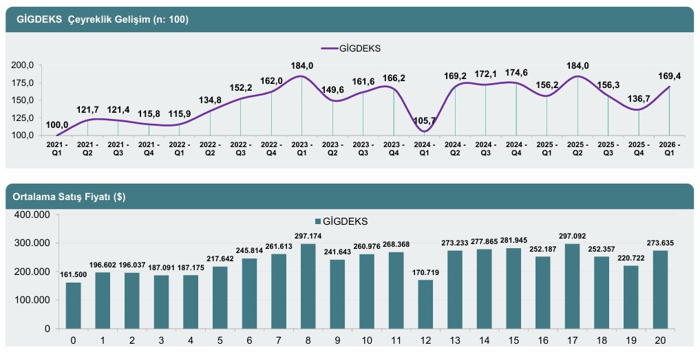 2025'in 3. ve 4. çeyreklerinde devam eden düşüş eğilimiyle 136,7 seviyesine kadar gerileyen endeks; 2026'nın ilk çeyreğinde 169,4 puan seviyesine hızlı bir sıçrama gerçekleştirdi. Birim fiyat bazında uluslararası yatırımcıya ortalama satış fiyatı ise 2025 son çeyrekteki 220.722 dolar seviyesinin ardından 2026 ilk çeyrekte 273.635 dolara yükseldi.