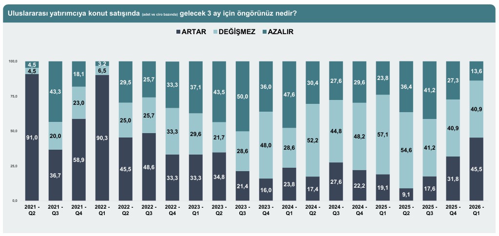 Ankete katılan GİGDER üyelerinin %40,9’u, önümüzdeki 3 ayda uluslararası yatırımcılara yönelik konut satışlarında belirgin bir değişim beklemediklerini aktardı. Satışlarda artış bekleyenlerin oranı %45,5 iken düşüş öngörenlerin oranı %13,6 olarak kaydedildi. Bu görünüm, sektörün önümüzdeki döneme temkinli iyimserlikle baktığını ortaya koyuyor.